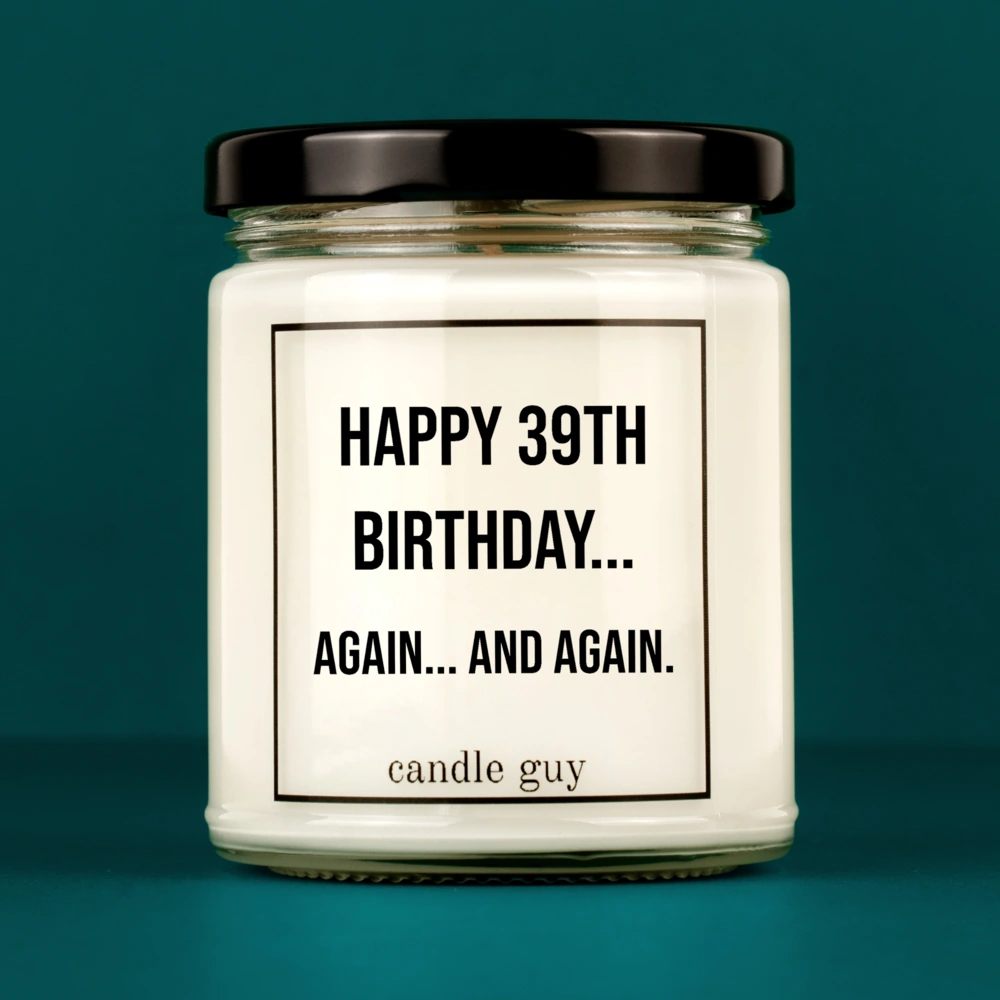 Die Spruch Kerze "Happy 39th Birthday.. again.. and again." brennt ultralange und duftet himmlisch – das perfekte Geschenk für dich oder andere.