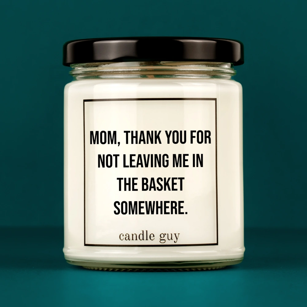 Die Spruch Kerze "Mom, thank you for not leaving me." brennt ultralange und duftet himmlisch – das perfekte Geschenk für dich oder andere.