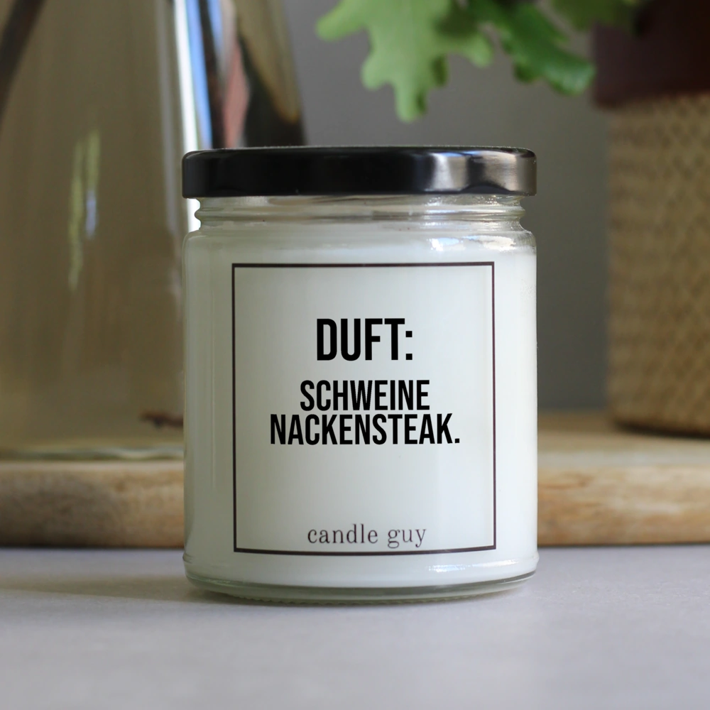 Die Spruch Kerze "Duft: Schweinenackensteak." brennt ultralange und duftet himmlisch – das perfekte Geschenk für dich oder andere.